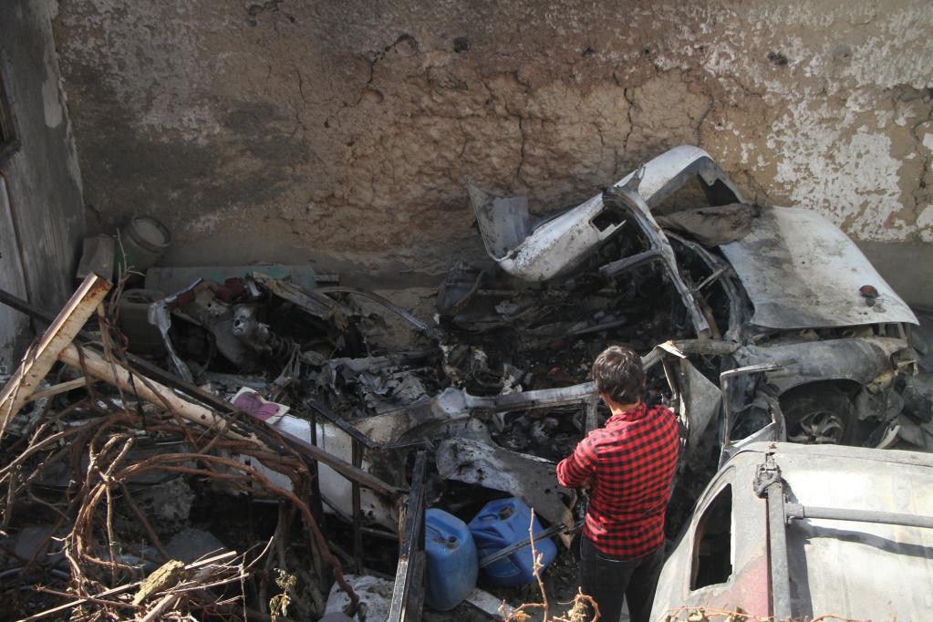 2021年9月2日,阿富汗喀布尔一处被美军空袭过的居民区的居民站在汽车残骸旁。新华社发(塞夫拉赫曼·萨菲摄)
