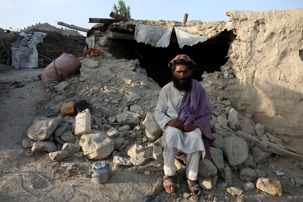 6月26日,在阿富汗霍斯特省,一名男子坐在地震震塌的房屋废墟旁。新华社发(塞夫拉赫曼·萨菲摄)