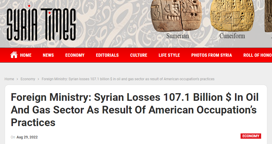 另据,叙利亚时报(Syria times)29日最新消息,从叙利亚外交部8月29日公布的数据来看,由于美国的占领行为,叙利亚在石油和天然气领域损失达1071亿美元。