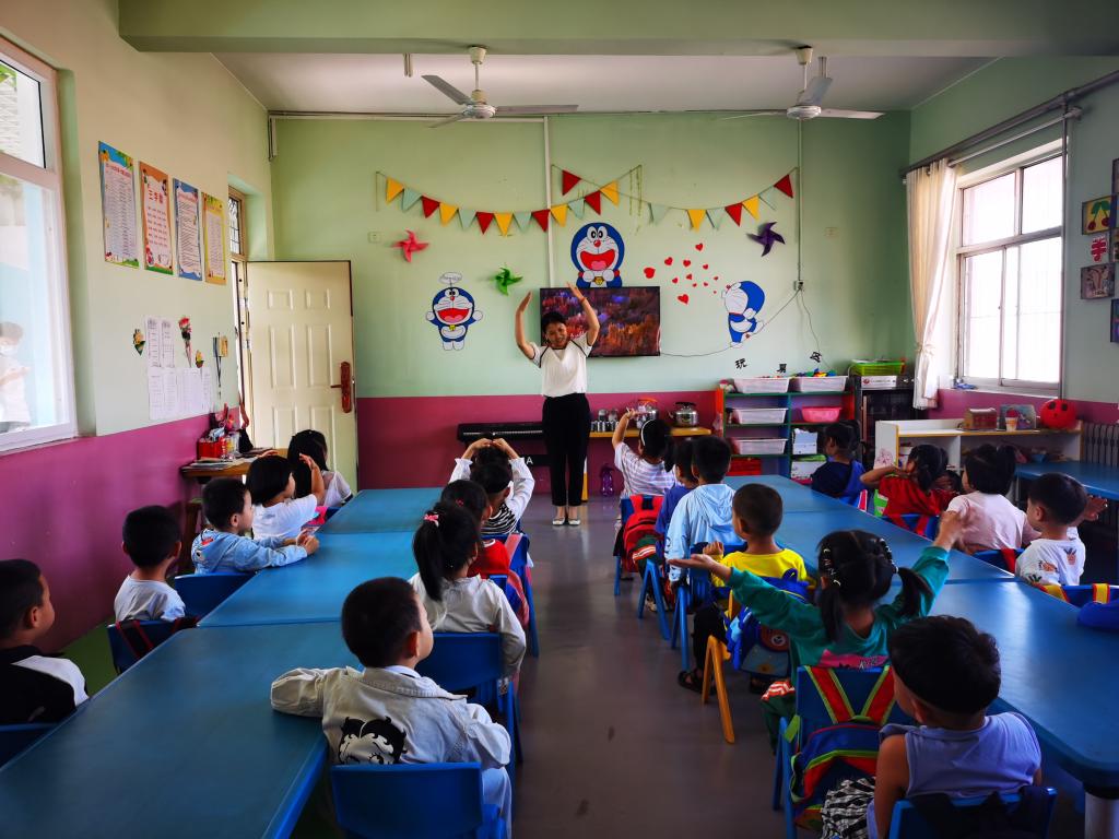 付晓强的妻子刘晓晓教孩子们舞蹈动作。(受访者供图)