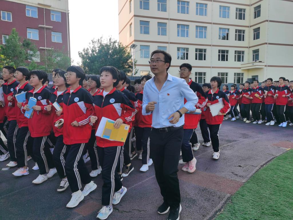 付晓强和学生一起跑操。(受访者供图)
