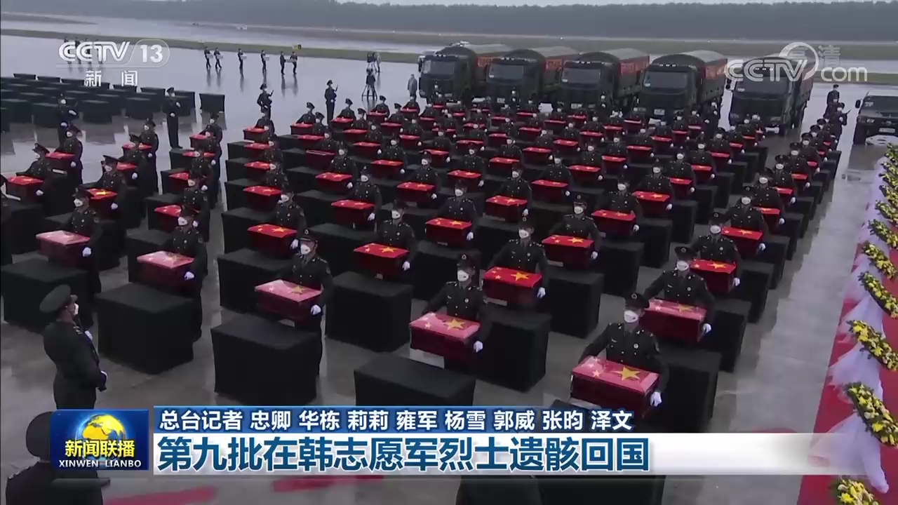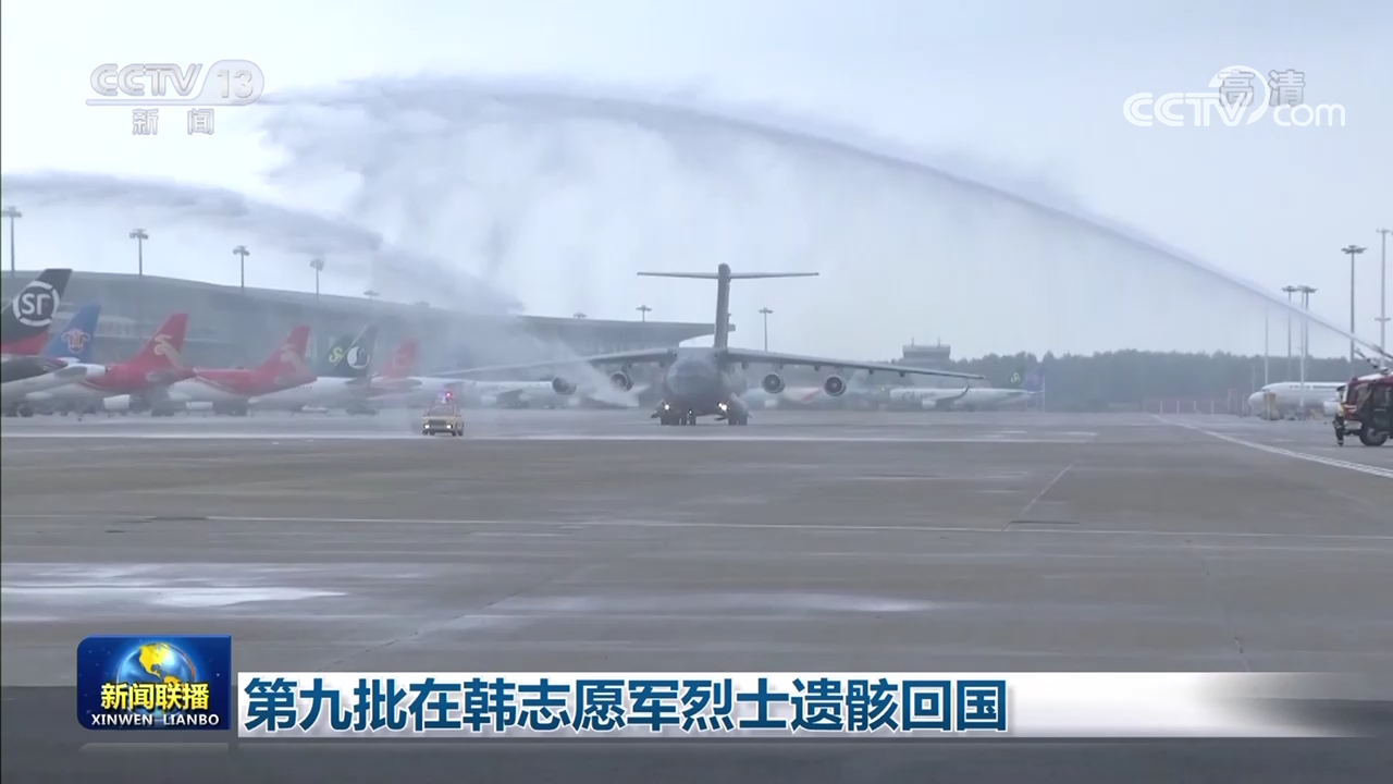 北京时间上午8时35分,中韩双方在韩国仁川国际机场举行第九批在韩中国人民志愿军烈士遗骸交接仪式,确认交接88位志愿军烈士遗骸及相关遗物。中方举行了悼念仪式,中国人民解放军礼兵护送烈士棺椁登上空军运-20专机。