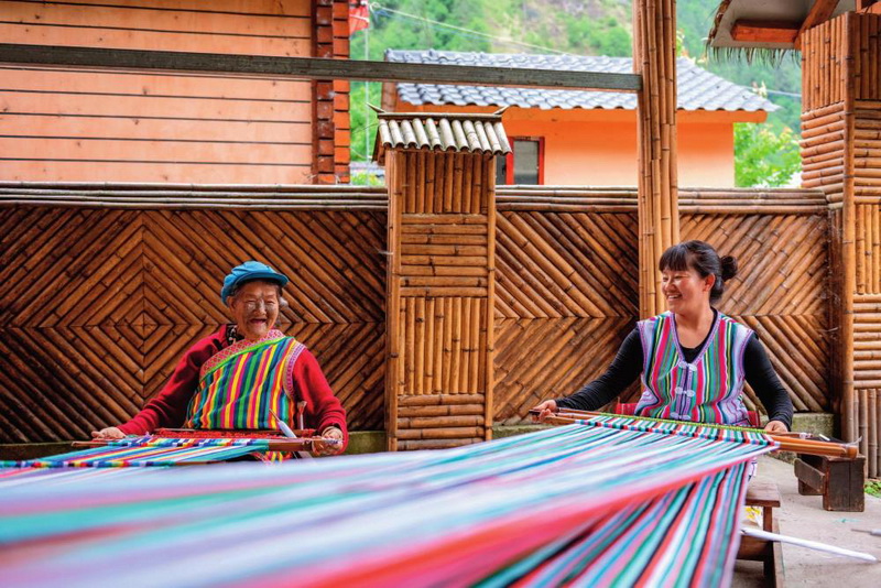 在云南省贡山独龙族怒族自治县独龙江乡迪政当村,独龙族老人李文仕(左)和女儿在编织独龙毯(2022 年 5 月 10 日摄) 曹梦瑶摄 / 本刊