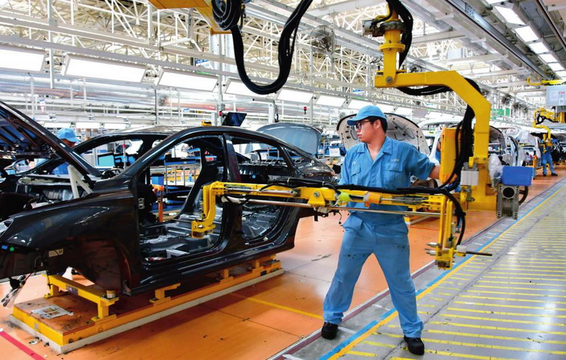 在上汽集团乘用车宁德基地总装车间,工人在新能源汽车生产线上作业(2022年8月18日摄) 魏培全摄 / 本刊