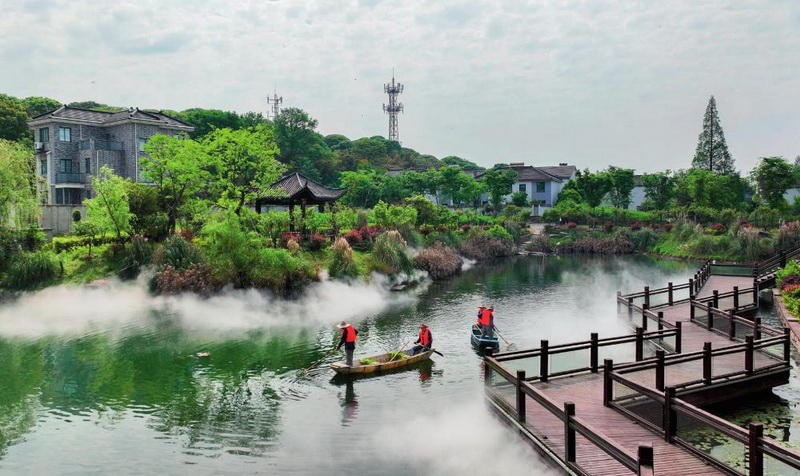 在浙江省湖州市德清县洛舍镇东衡村,河道保洁员在进行日常保洁(2022年4月12日摄) 王正摄 / 本刊