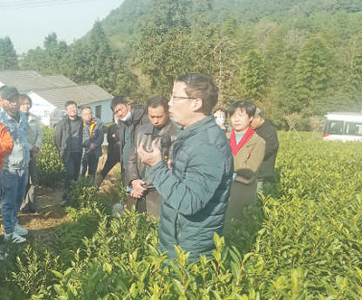钱义荣(前)在指导村民学习种茶技术。
