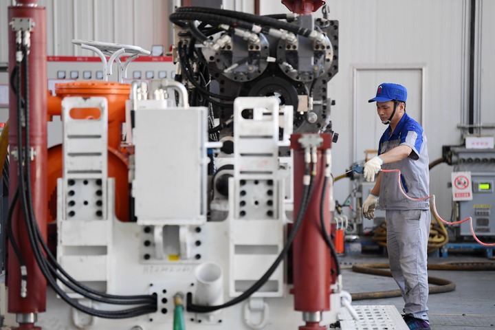2022年6月17日,在位于秦创原总窗口所在地陕西省西咸新区的陕西太合智能钻探有限公司,工人准备对智能定向钻机进行性能调试。新华社记者 李一博 摄