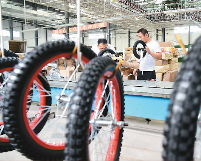 连日来,安徽省蚌埠市五河县自行车产业园的各家企业开足马力加紧生产,保障外贸订单需求按进度完成。五河县自行车产业园目前已经入驻18家自行车企业,相关企业的产品主要出口法国、意大利等地。图为工人在生产线上忙碌。