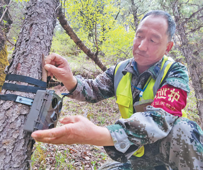 祁连山国家公园寺沟管护站的生态管护员在巡护途中检查野外红外相机。
