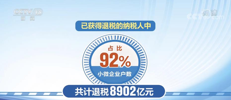 分企业规模看,小微企业是受益主体。已获得退税的纳税人中,小微企业户数占比92%,共计退税8902亿元。