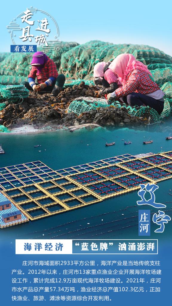庄河市海域面积2933平方公里,海洋产业是当地传统支柱产业。从靠海吃海到向海而兴,2012年以来,庄河市13家重点渔业企业累计完成12.9万亩现代海洋牧场建设。