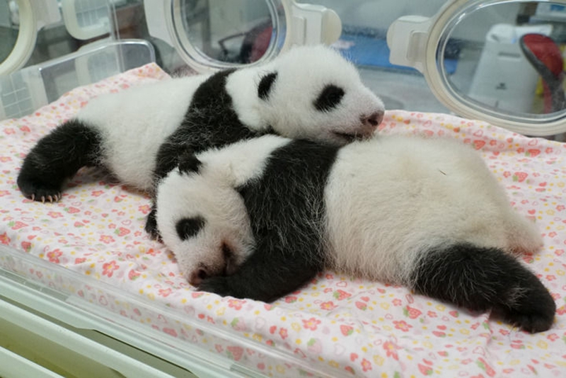 这是2021年8月5日拍摄的大熊猫幼崽“蕾蕾”(左)和“晓晓”(右)。新华社发(东京动物园协会供图)