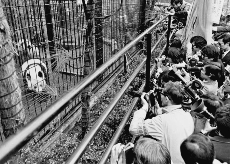 1972年10月28日,第一批旅日大熊猫“康康”和“兰兰”乘专机抵达东京,时任内阁官房长官二阶堂进亲自前往机场迎接。从机场到上野动物园,一路由警车开道、百余名警备人员护送。同年11月初,“康康”和“兰兰”首次公开亮相时,6万名游客将上野动物园挤得水泄不通。次年,上野动物园入场人数创下920万人的最高纪录。日本动漫《樱桃小丸子》曾再现当时全民轰动争相一睹大熊猫的场面。