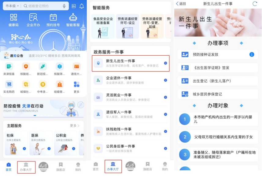 津云新闻讯:以前,如果家里迎来新生儿宝宝,家长往往要去医院、社区、派出所跑四五趟,需要两三天才能办完出生证明、落户口、参加医保等手续。现在,只要手机登录“津心办”APP办理这些手续,再也不用跑腿,一天就能全部办妥!市委网信办、市政务服务办、市大数据管理中心共同从群众办事视角出发,持续推动系列“一件事”数字化政务服务,于近期在“津心办”APP上线试运行第一批9项“一件事一站办”场景,将跨部门业务以主题为牵引再造线上流程,用数据跑路代替群众跑腿,让市民获得更多智慧便捷、省时省力的办事体验。
