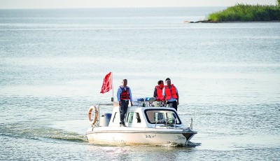 洪泽湖河湖管理所工作人员在湖上巡逻。新华社发