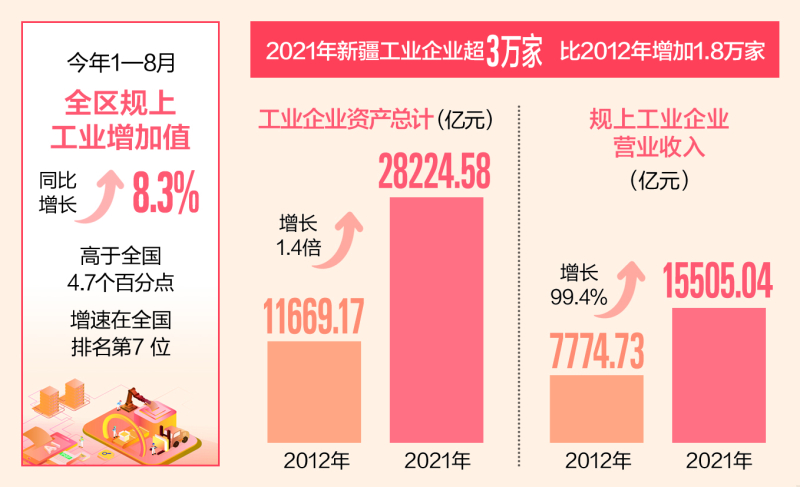 十年间,新疆促进中小企业发展力度之大、出台政策之密集、含金量之高,前所未有。新疆企业亮功底、展实力、见真章,在自己的赛道上精耕细作,一步一个脚印地开拓市场。2021年,新疆工业企业超3万家,比2012年增加1.8万家,增长1.5倍。其中:规模以上工业4082家,比2012年增加2123家,增长1.1倍。企业资产总计由2012年11669.17亿元提高到2021年28224.58亿元,增长1.4倍。