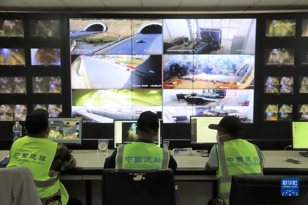 10月3日,在阿尔及利亚麦迪亚省,中建集团工程师在阿尔及利亚南北高速公路希法段隧道监控室作业。新华社记者 吴天雨 摄
