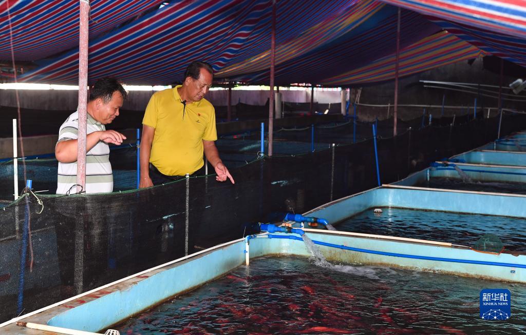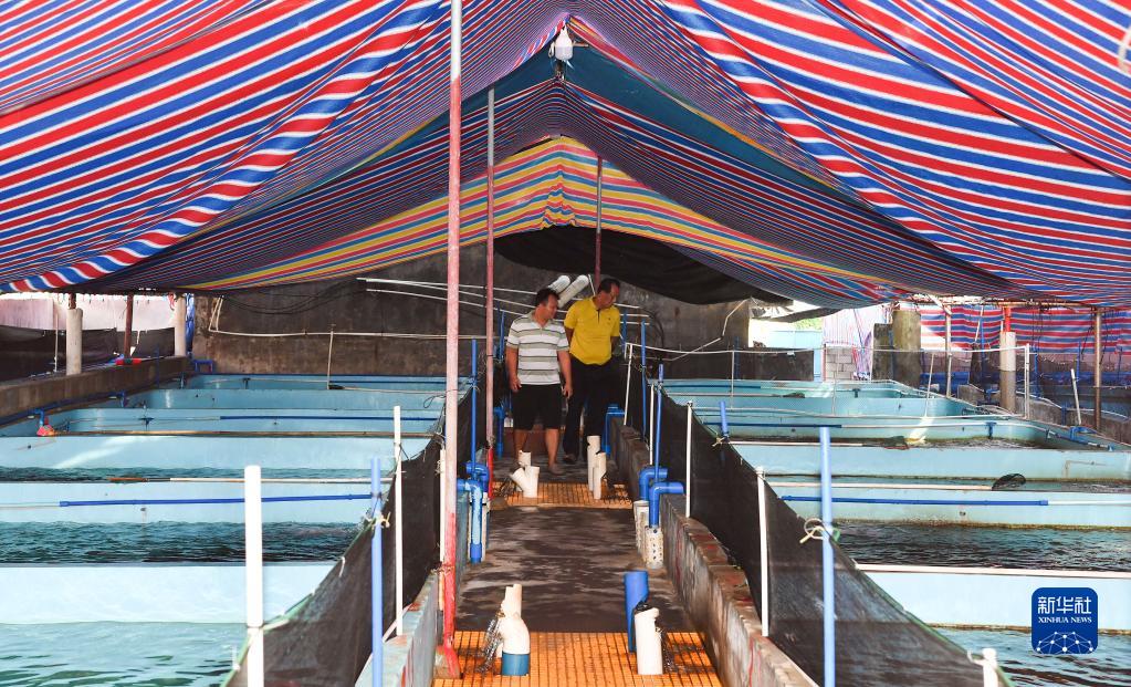王书茂(右)在海南省琼海市潭门镇潭门村的一处养殖基地调研(9月14日摄)。新华社记者 杨冠宇 摄