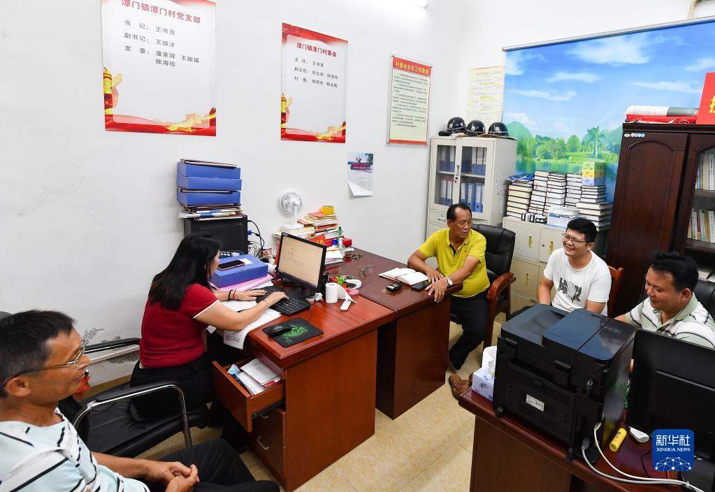 王书茂(中)在海南省琼海市潭门镇潭门村村委会办公室同村干部讨论工作(9月14日摄)。新华社记者 杨冠宇 摄