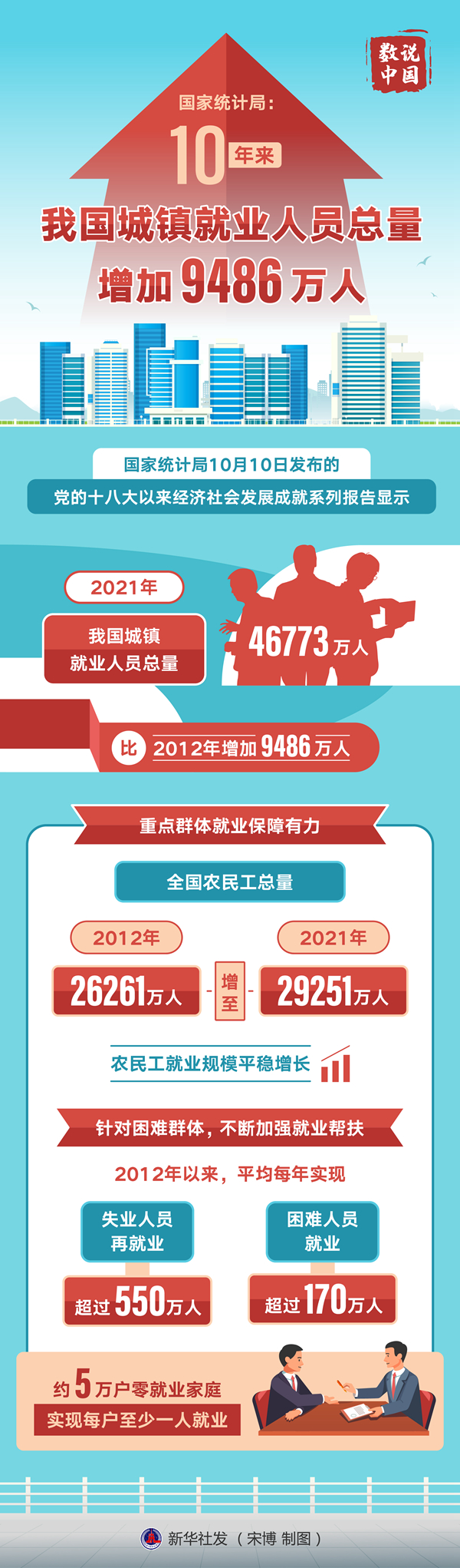 国家统计局10日发布的党的十八大以来经济社会发展成就系列报告显示,2021年,我国城镇就业人员总量达到46773万人,比2012年增加9486万人。