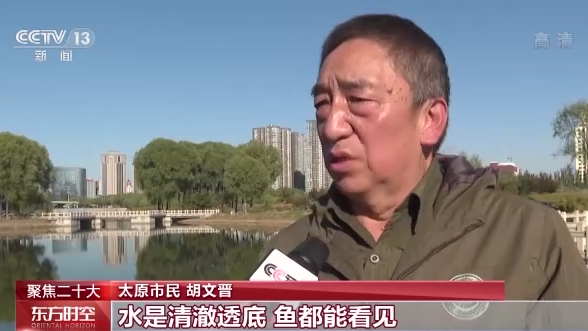太原市民 胡文晋:水是清澈透底,鱼都能看见,绿色比较多了,非常幸福,有获得感、幸福感。二十大以后,我相信总书记会带领我们过上更加幸福美满的生活,更加环境优美。