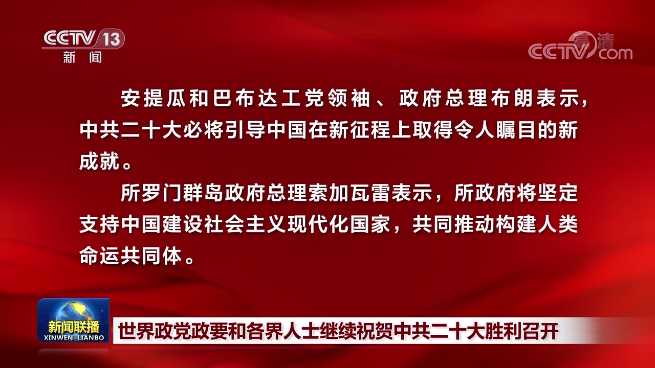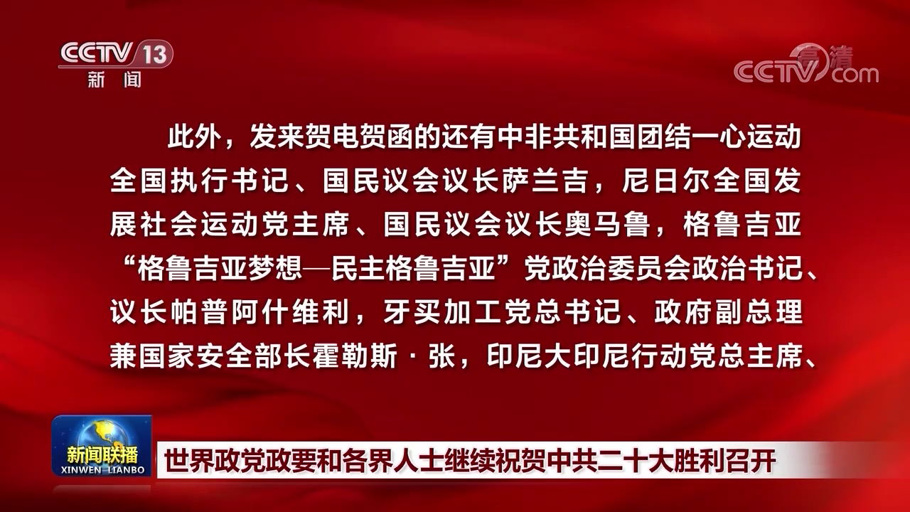 央视网消息(新闻联播):在中国共产党第二十次全国代表大会召开之际,世界政党政要和各界人士继续致电致函中共中央和习近平总书记,热烈祝贺中共二十大胜利召开。