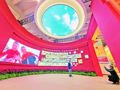 观众在“奋进新时代”主题成就展中央展区由302张照片组成的笑脸墙前拍照留念。本报记者 闫汇芳摄/光明图片