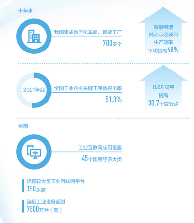 一个个竞相涌现的新业态新模式,一次次落地显效的新场景新尝试,见证着党的十八大以来,我国智能制造所取得的长足进步。这十年,产业数字化转型全面推进。截至2021年底,全国工业企业关键工序数控化率、数字化研发设计工具普及率分别达到51.3%、74.7%,比2012年分别提高30.7、25.9个百分点。这十年,智能制造发展水平稳步提升。我国已建成700多个数字化车间、智能工厂,智能制造试点示范项目生产效率平均提高48%,产品研制周期平均缩短38%,产品不良品率平均降低35%,炼化、印染、家电等领域智能制造水平处于世界领先地位。这十年,智能制造的底座更为坚实。工业互联网应用已覆盖45个国民经济大类,培育较大型工业互联网平台150余家,连接工业设备超过7800万台(套)。