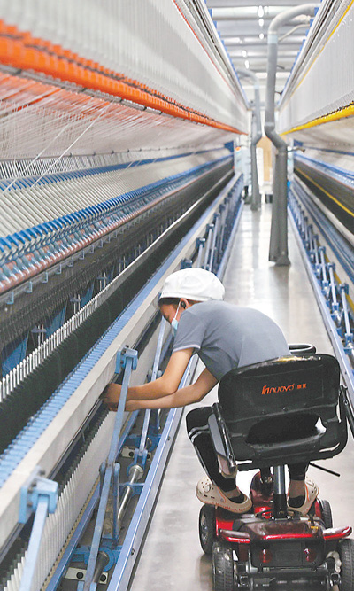 江苏省南通市大生集团的数字化纺纱车间拥有全流程国产设备示范生产线,用工仅需15人/万锭。许丛军摄(人民视觉)