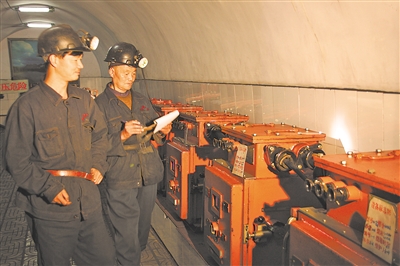 过去,井下设备巡检只能靠人工。图为陕煤集团两名工人在巡检。巨宏伟摄(资料照片)