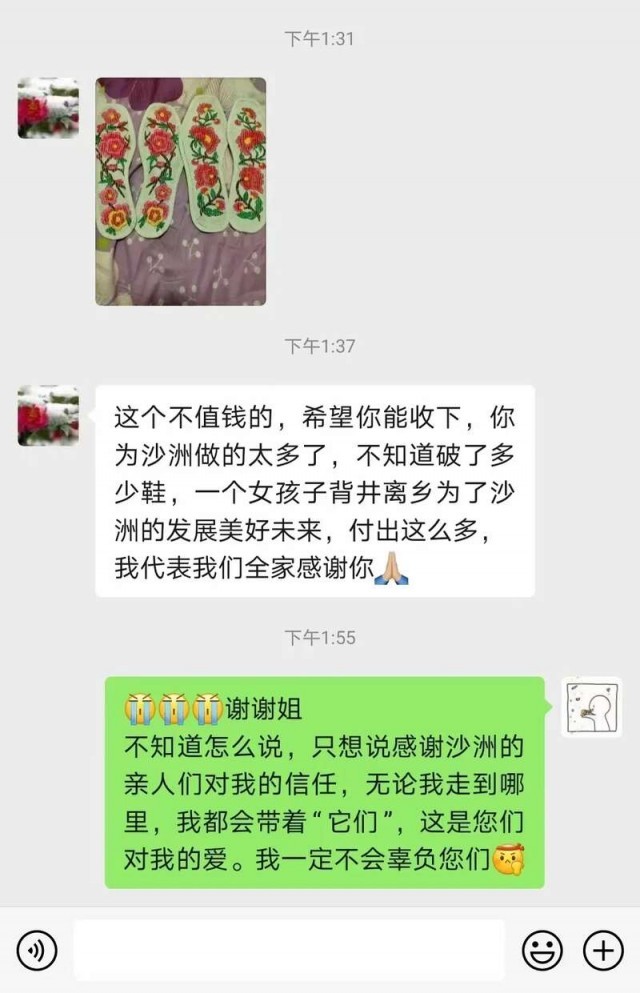 “沙洲村的老百姓对我非常好,在误以为我要离开的时候连夜赶工绣织两双鞋垫给我,我原先没有想到我一个外地选调生会和当地的人民群众建立这么深厚的感情。沙洲的人民群众用真诚、热情包容滋养了我、温暖了我,让我感觉这两年真的青春无悔。”
