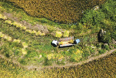 2022年9月至10月中旬,世界遗产地哈尼梯田的稻谷相继成熟,从山脚到山顶,村民们陆续开镰收割。新华社记者 江文耀摄