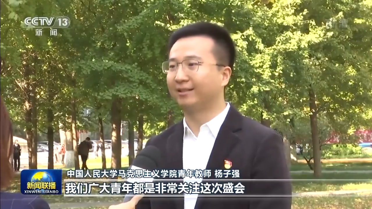 中国人民大学马克思主义学院青年教师 杨子强:我们广大青年都是非常关注这次盛会,是带着感情读(二十大)报告的,因为报告当中有我们自己,有我们共同梦想的中国的未来。我们要深刻去领悟“两个确立”的决定性意义,心怀“国之大者”,把青春奋斗融入中国式现代化这样一项伟大而艰巨的事业。