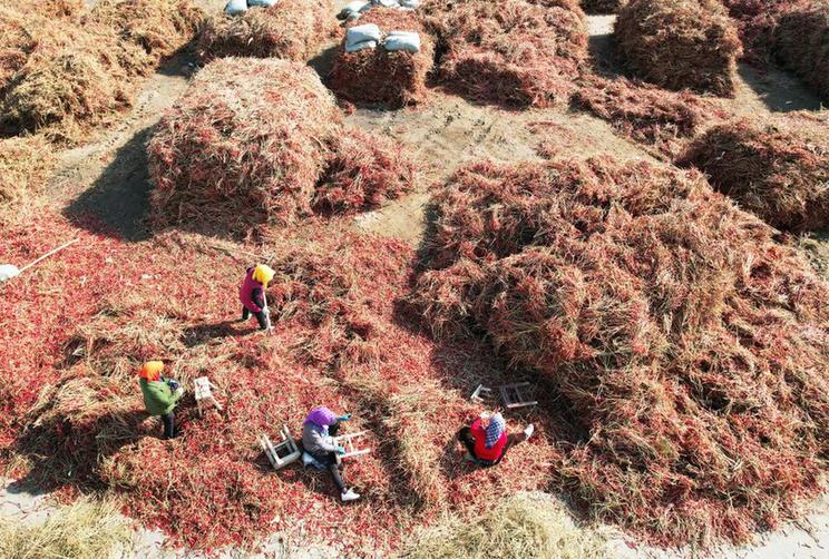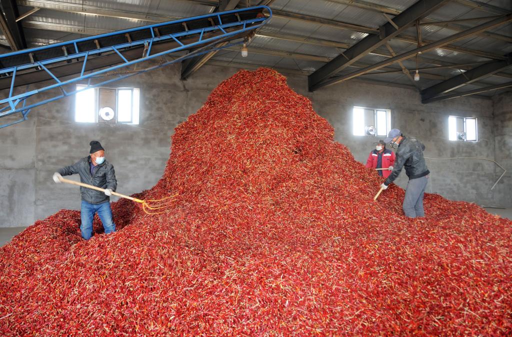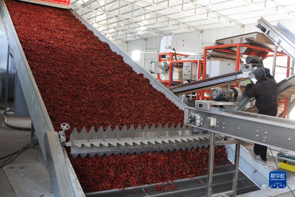 工人在白脑包镇辣椒加工厂粗加工辣椒。(新华社记者李云平 摄)