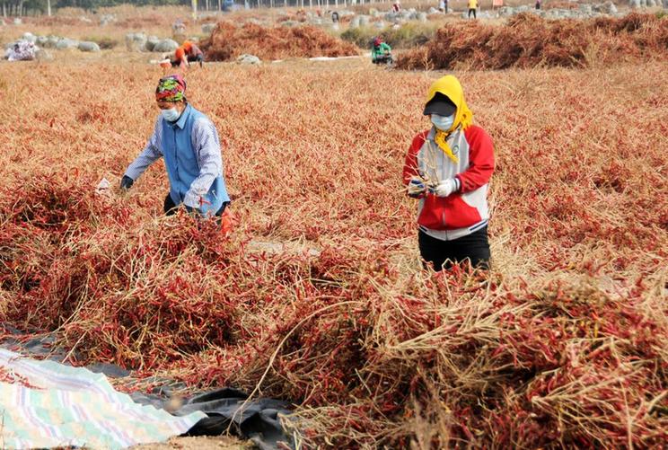 工人在双河镇万亩辣椒产业示范园采摘辣椒。(新华社记者李云平 摄)