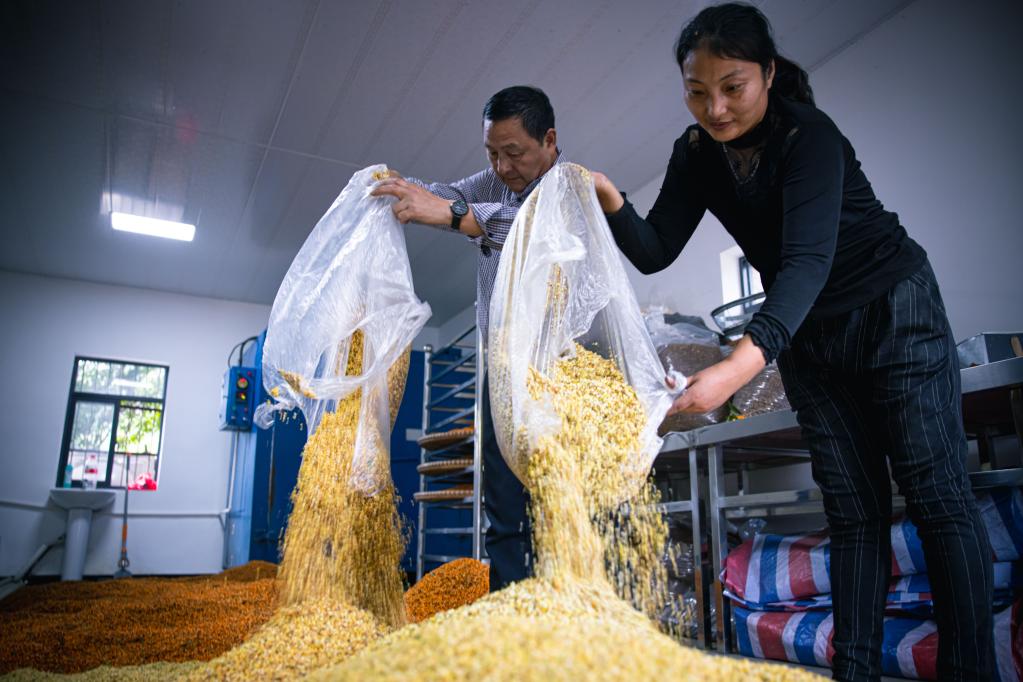 10月25日,桐庐县旧县街道母岭村村民将收来的桂花堆起准备烘干。新华社记者 江汉 摄