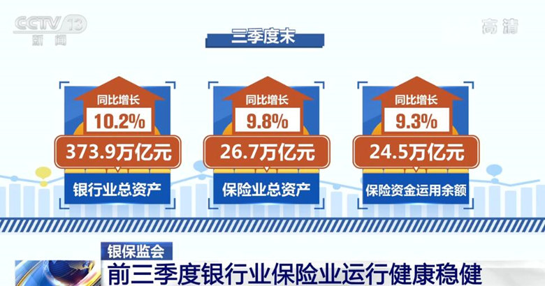 数据显示,三季度末,银行业总资产373.9万亿元,同比增长10.2%;保险业总资产26.7万亿元,同比增长9.8%。保险资金运用余额24.5万亿元,同比增长9.3%。