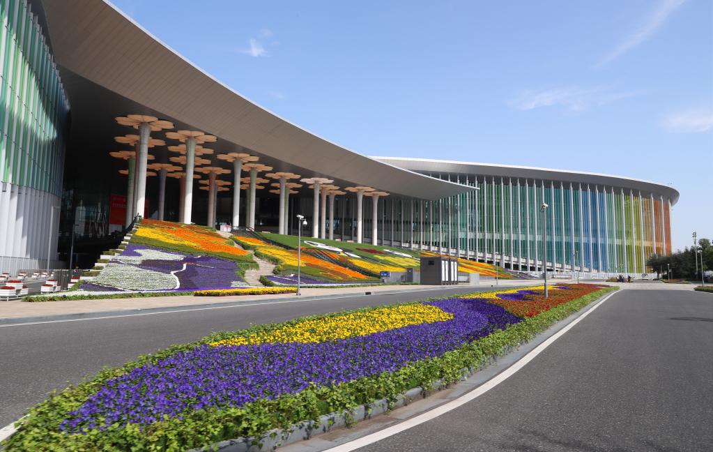 国家会展中心(上海)场馆外部进博会主题装饰工程进入收尾阶段。新华社记者 方喆 摄