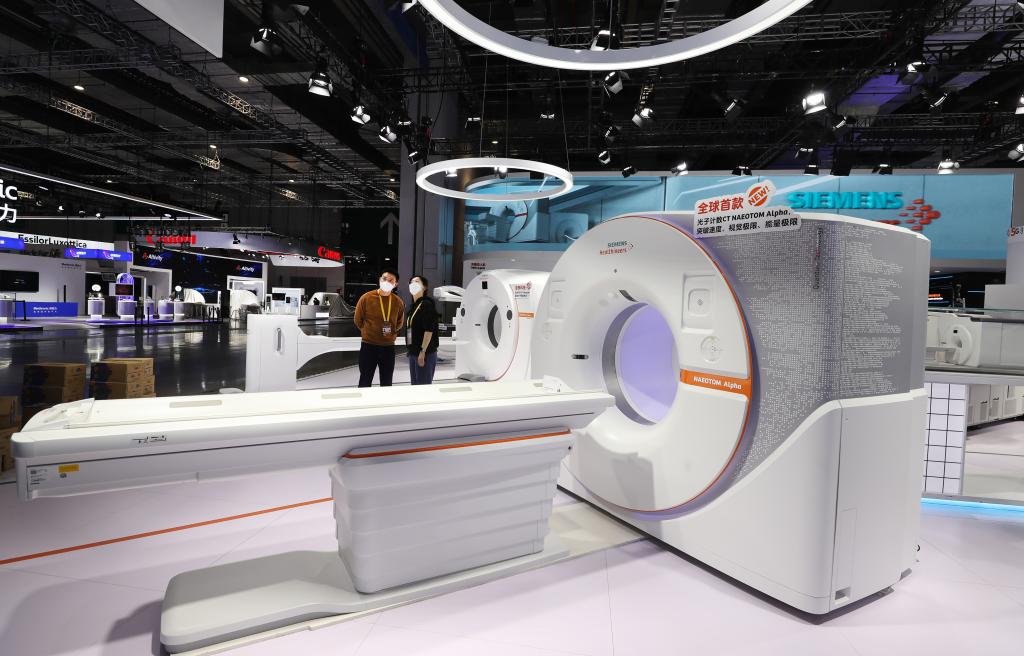 11月2日拍摄的德国西门子公司在进博会展台展出的大型医疗设备。(新华社记者方喆摄)
