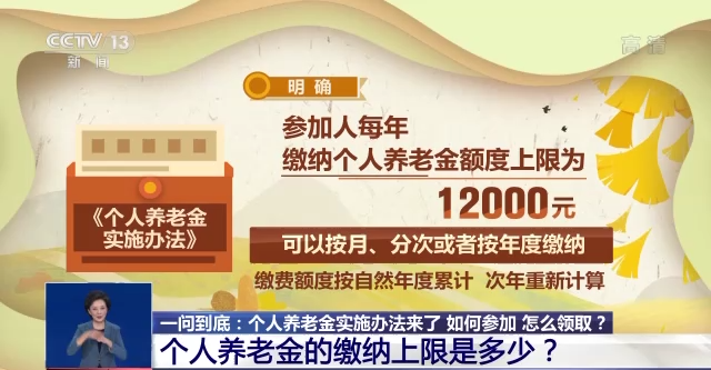 《实施办法》明确,参加人每年缴纳个人养老金额度上限为12000元,可以按月、分次或者按年度缴纳,缴费额度按自然年度累计,次年重新计算。