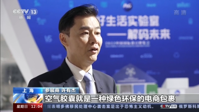 参展商 许有杰:空气胶囊是一种绿色环保的电商包裹,用了40%的空气来取代原材料,它是可以回收可以再生的。