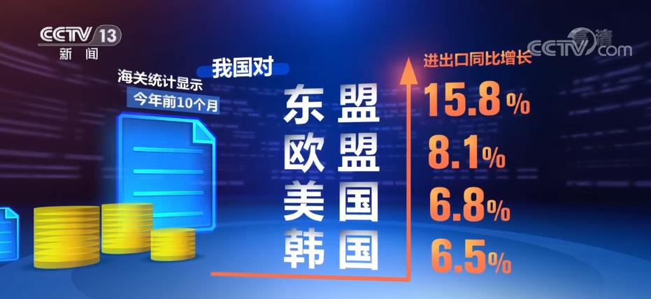 海关统计显示,今年前10个月,我国对东盟、欧盟、美国、韩国进出口同比分别增长15.8%、8.1%、6.8%和6.5%。东盟继续为我国第一大贸易伙伴,占我国外贸总值的15.2%。