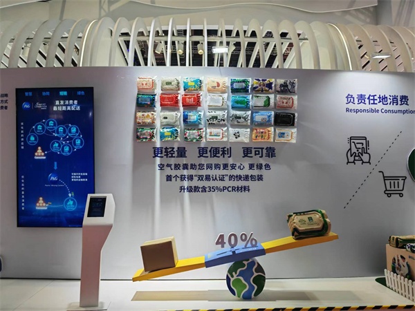 低碳风是第五届进博会主流,本届进博会坚持“绿色、环保、可持续”办展方向,持续打造“零碳进博”。在宝洁展馆,墙上各色的“空气胶囊”引来展商询问。记者了解到,宝洁新升级的“空气胶囊”在进博会迎来全球首秀,不仅在生产所用材料中加入再生塑料PCR,还带来了适用于不同行业和产品的解决方案,助力实现快递包装“零碳”。