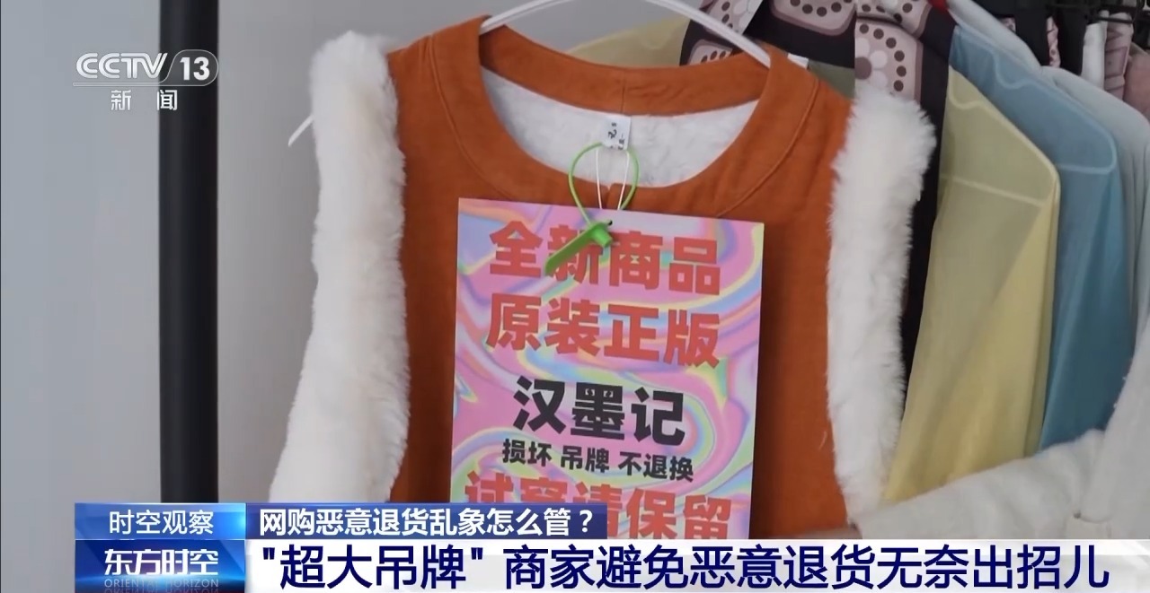网购是如今很多人买衣服的主要方式,很多平台上也都有“七天无理由退货”的规则,让消费者可以放心买、放心退。然而,这个原本为保护消费者而设立的机制,如今却被一些人恶意利用。一些商家表示,一旦遭遇恶意退货,常常会遇到取证难、维权成本高的问题。于是现在一些商家,特别是服装商家,也想了不少招儿,比如用超大吊牌。