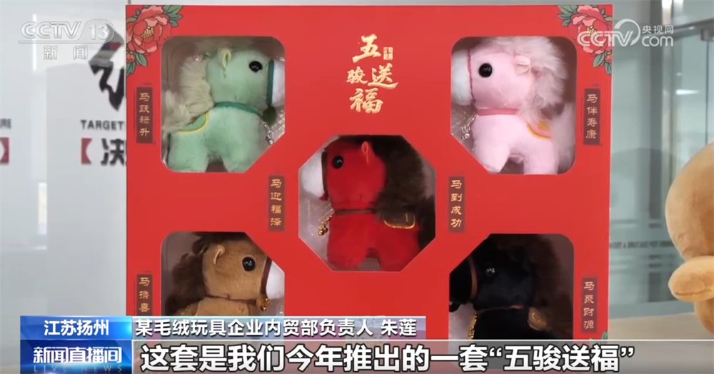 江苏扬州某毛绒玩具企业内贸部负责人 朱莲:这套是我们今年推出的“五骏送福”,五色小马寓意“福、禄、寿、喜、财”。年前已经接到20万套订单,目前正在加班加点赶制,春节前交付。