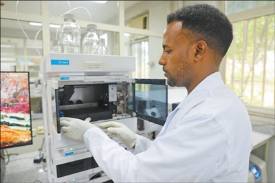在埃塞俄比亚农业部下属的动物产品和投入品质量检测中心,质量分析师法努埃尔正在进行样本检测。本报记者 沈小晓摄