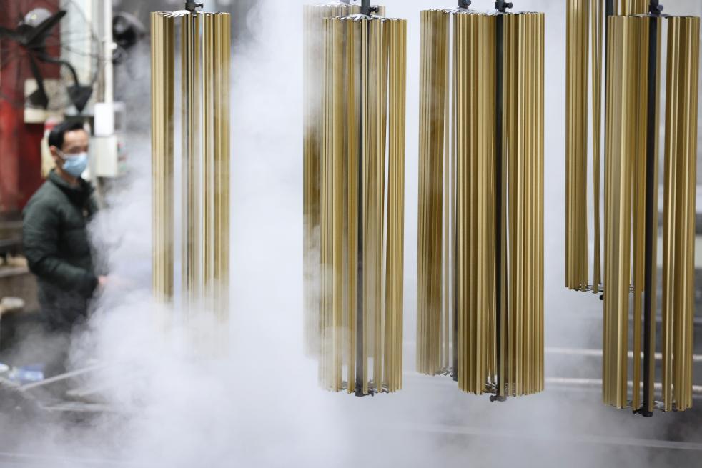 1月19日,工人在位于浙江省湖州市德清县乾元镇的浙江沃德新材料科技有限公司车间赶制铝型材产品订单。新华社发(倪立芳摄)