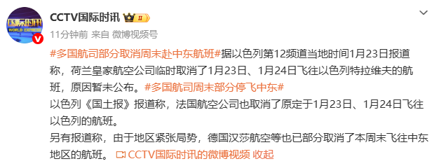 另有报道称,由于地区紧张局势,德国汉莎航空等也已部分取消了本周末飞往中东地区的航班。
