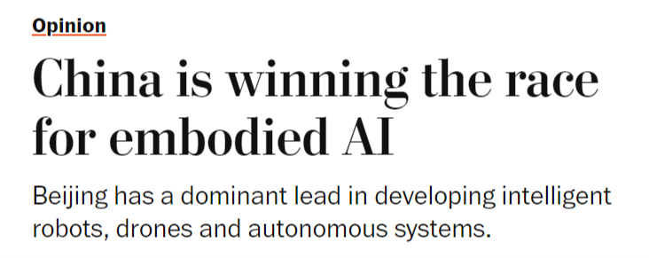 文章还认为,中国可凭借现有的制造优势,成为全球具身人工智能系统的主要生产中心。与5G网络或太阳能电池板不同,具身人工智能可能成为在全球多个行业将物理任务直接自动化的基础。这将使中国成为智能机器人和自主平台的主要全球供应国,从而为其带来强大的地缘经济影响力。