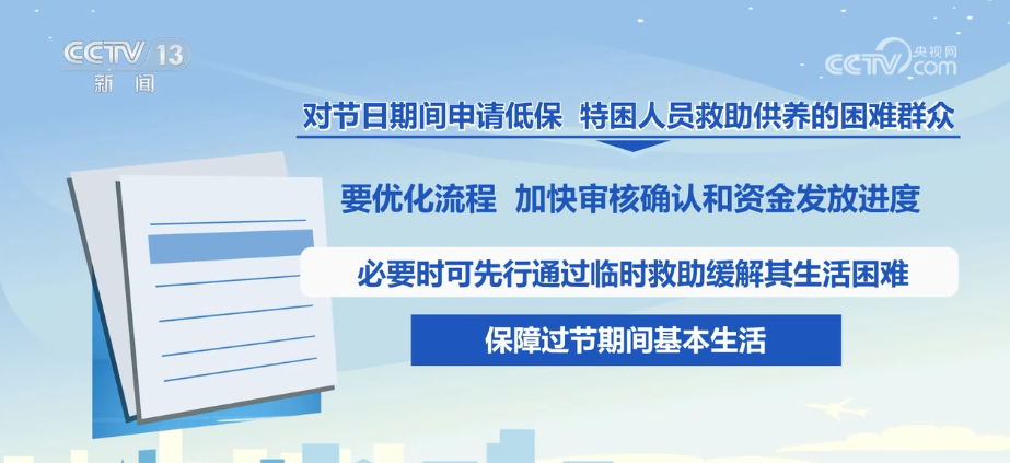 鼓励有条件的地方在元旦春节期间提前发放相关救助资金或增发一次性生活补贴。对节日期间申请低保、特困人员救助供养的困难群众,要优化流程、加快审核确认和资金发放进度,必要时可先行通过临时救助缓解其生活困难,保障过节期间基本生活。